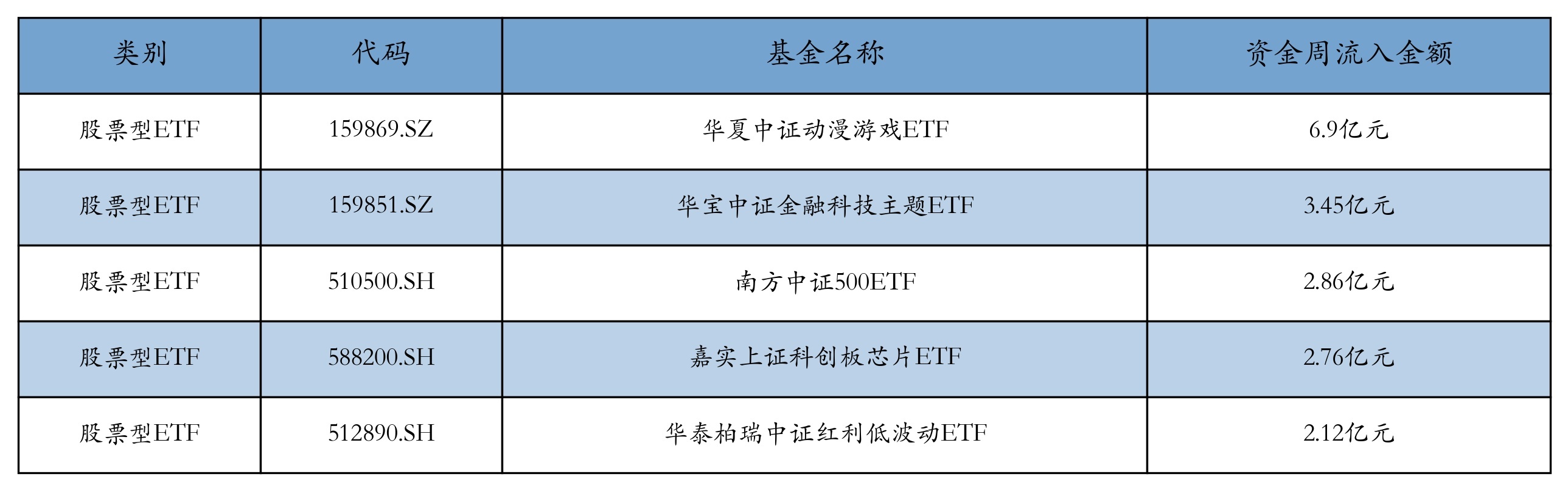 上周股票型ETF资金流入最多的5只ETF及其流入金额分别为:华夏中证动漫游戏ETF(流入6.9亿元)、华宝中证金融科技主题ETF(流入3.45亿元)、南方中证500ETF(流入2.86亿元)、嘉实上证科创板芯片ETF(流入2.76亿元)、华泰柏瑞中证红利低波动ETF(流入2.12亿元)。详情见下表: