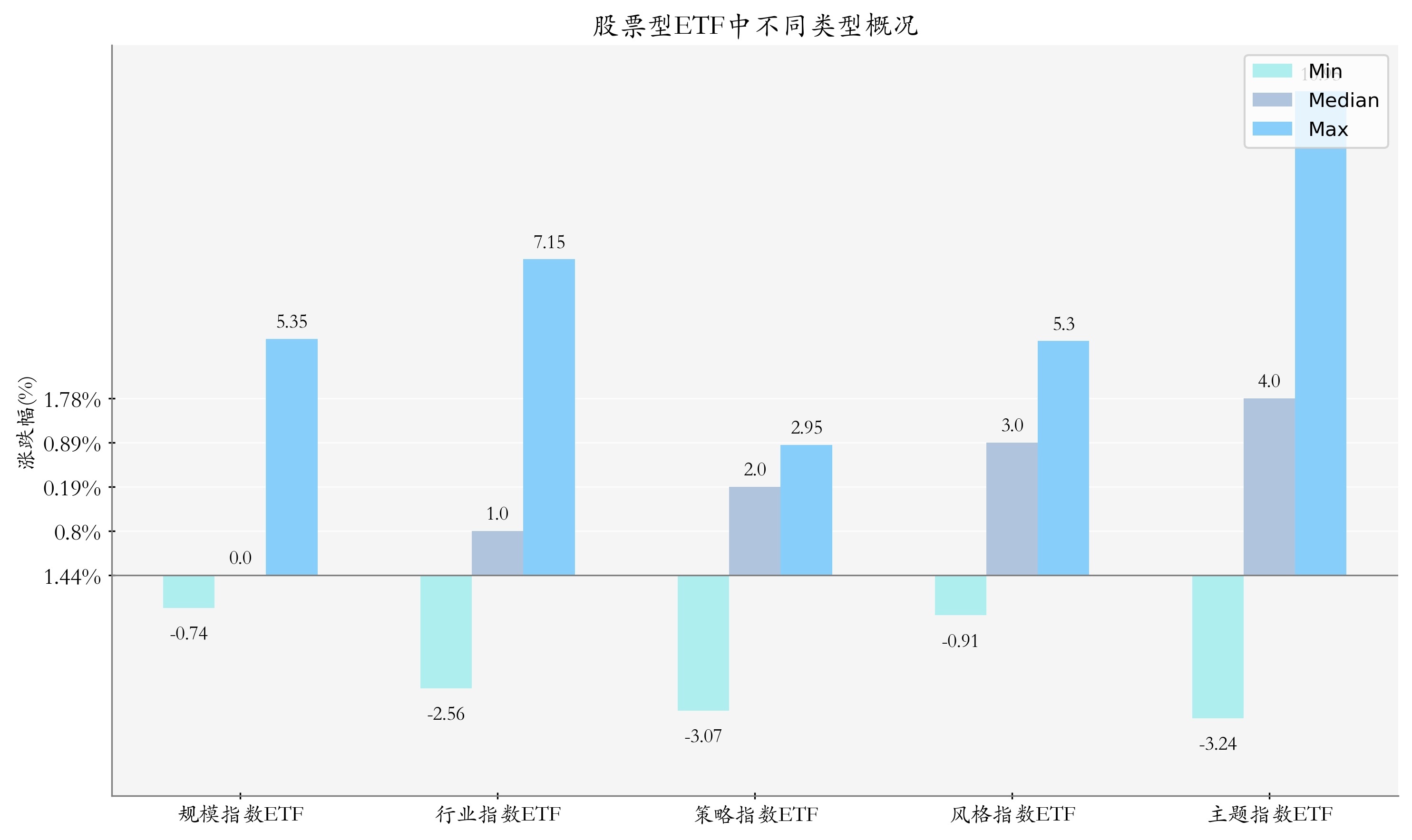 上周股票型ETF周度收益率中位数为1.32%%。其中按照不同分类,规模指数ETF中嘉实上证科创板综合增强策略ETF周度收益率最高,为5.35%;行业指数ETF中广发国证通信ETF周度收益率最高,为7.15%;策略指数ETF中中金MSCI中国A股国际质量ETF周度收益率最高,为2.95%;风格指数ETF中易方达创业板成长ETF周度收益率最高,为5.3%;主题指数ETF中富国创业板人工智能ETF周度收益率最高,为10.95%。