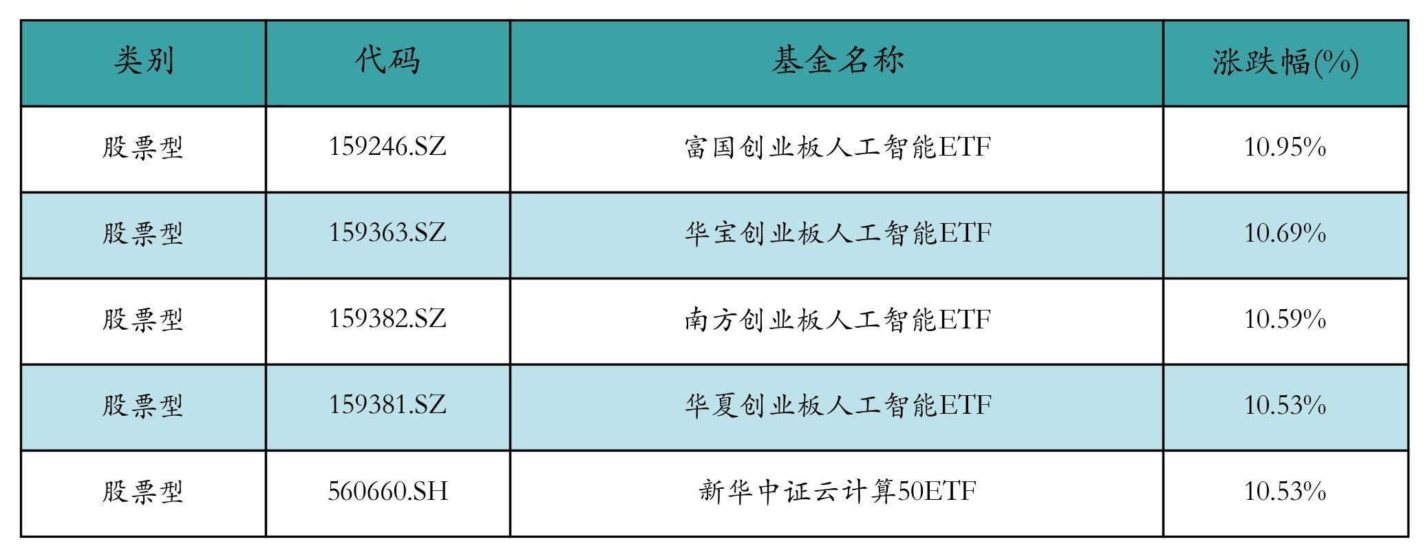 上周股票型ETF涨幅最高的5只ETF及其收益率分别为:富国创业板人工智能ETF(10.95%)、华宝创业板人工智能ETF(10.69%)、南方创业板人工智能ETF(10.59%)、华夏创业板人工智能ETF(10.53%)、新华中证云计算50ETF(10.53%)。详情见下表: