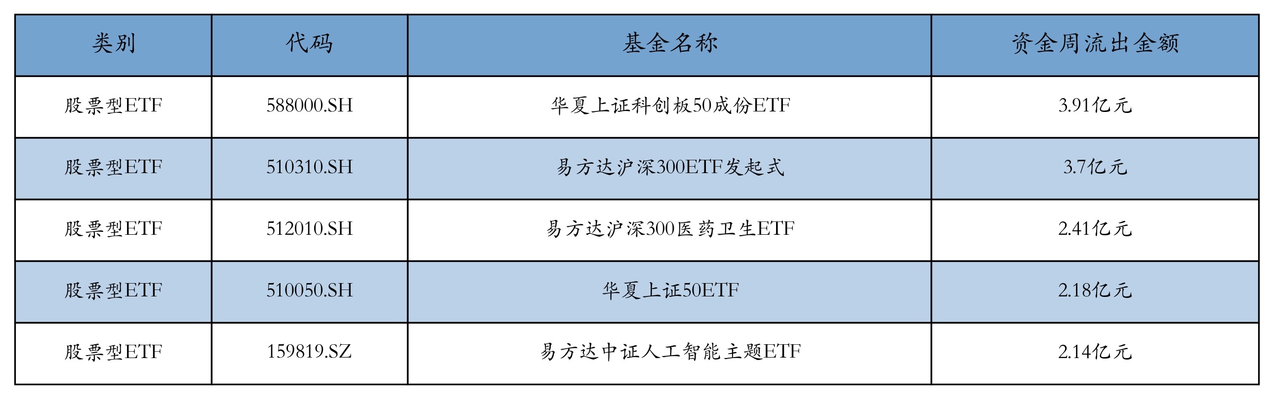 上周股票型ETF资金流出最多的5只ETF及其流出金额分别为:华夏上证科创板50成份ETF(流出3.91亿元)、易方达沪深300ETF发起式(流出3.7亿元)、易方达沪深300医药卫生ETF(流出2.41亿元)、华夏上证50ETF(流出2.18亿元)、易方达中证人工智能主题ETF(流出2.14亿元)。详情见下表:
