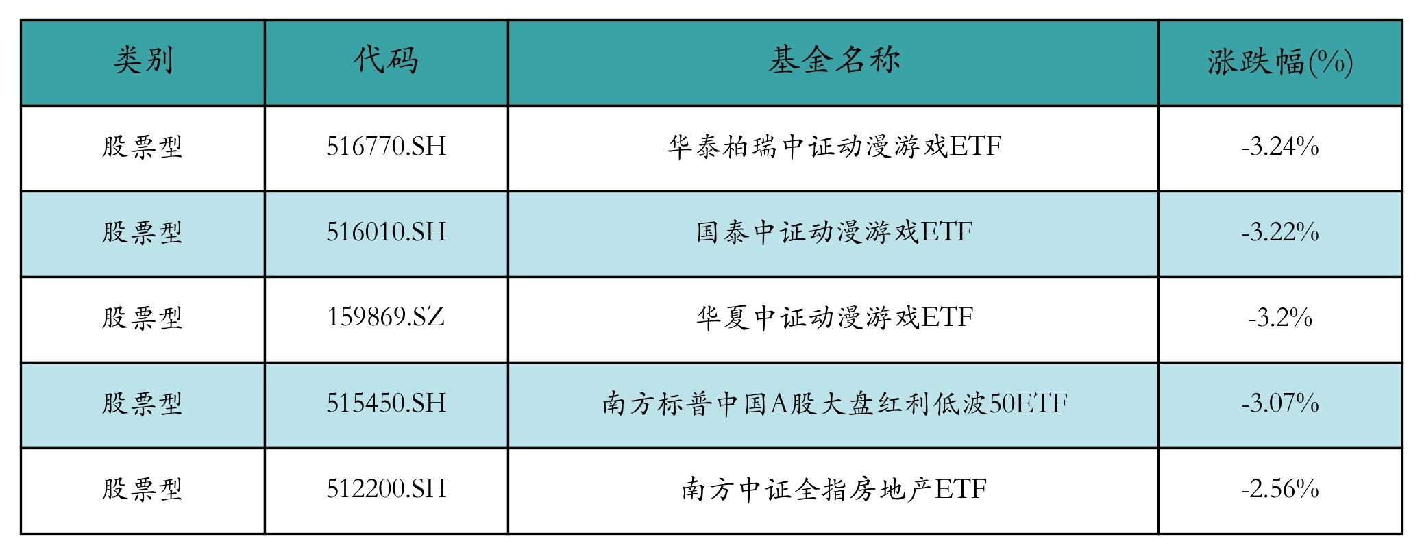 上周股票型ETF跌幅最大的5只ETF及其收益率分别为:华泰柏瑞中证动漫游戏ETF(-3.24%)、国泰中证动漫游戏ETF(-3.22%)、华夏中证动漫游戏ETF(-3.2%)、南方标普中国A股大盘红利低波50ETF(-3.07%)、南方中证全指房地产ETF(-2.56%)。详情见下表: